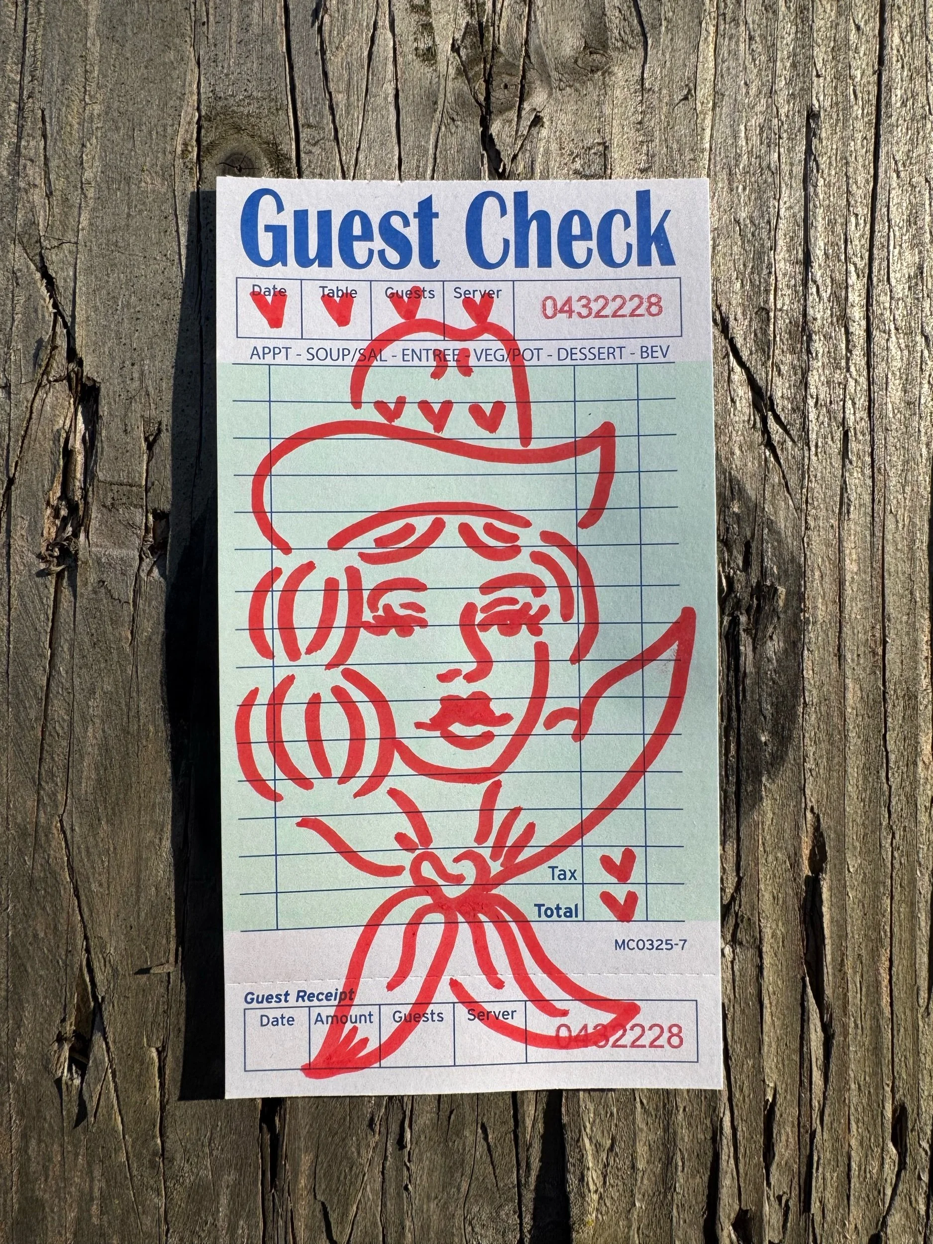 Guest Check Cowboy now available to purchase. The image is the same but each one will have slight differences.